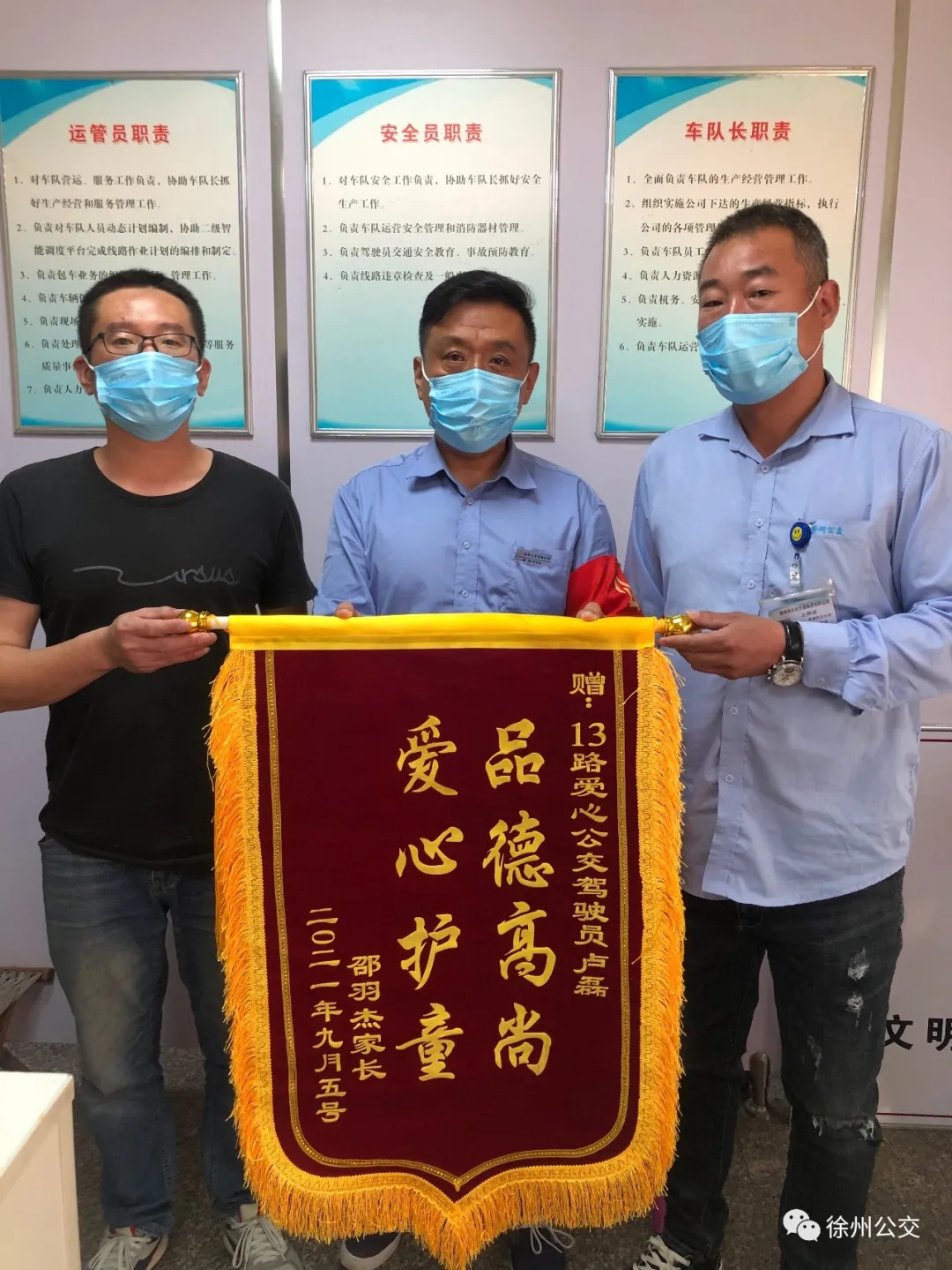 9月8日,市民邵先生來(lái)到京徐巴士公司,送來(lái)了一面印有“品德高尚,愛(ài)心護(hù)童”的錦旗,感謝13路駕駛員盧磊的愛(ài)心善舉。