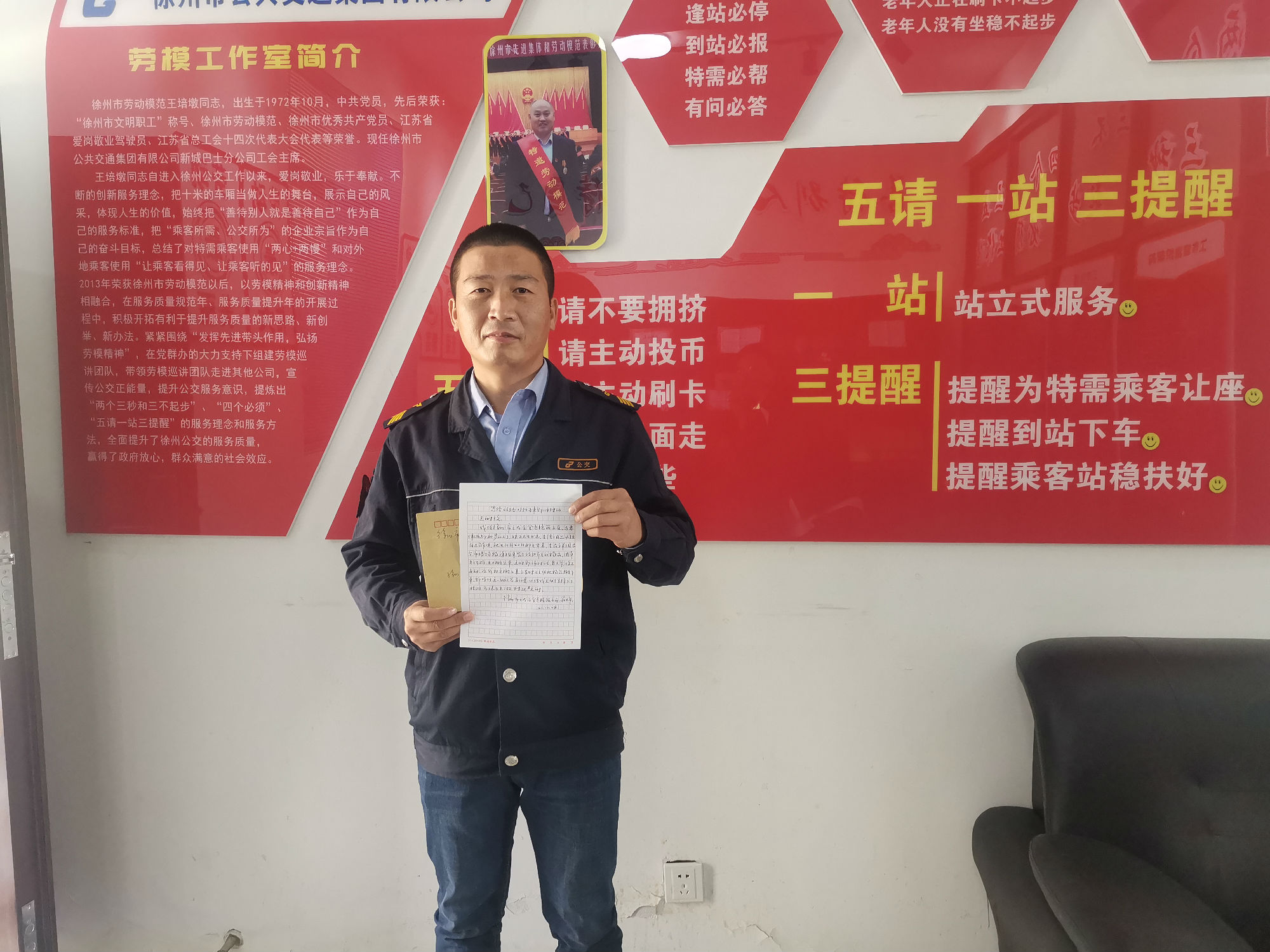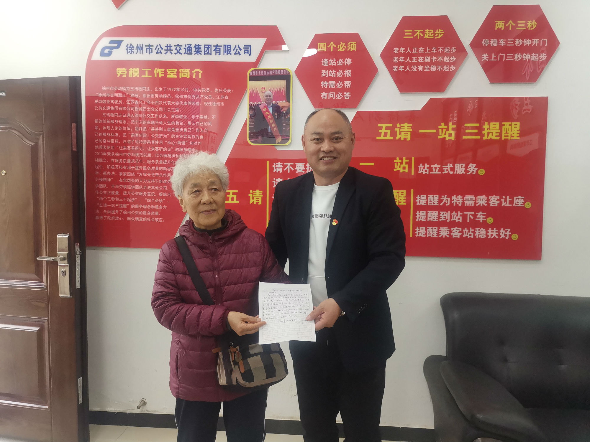 10月28日下午,一位滿頭銀發(fā)的老人拿著一封親手寫的感謝信來(lái)到了徐州公交新城公司,老人說(shuō):“有一位駕駛員,經(jīng)常幫助我和老伴,但我不知道他叫什么,只知道他在46路2750號(hào)公交車?!苯?jīng)核實(shí),正是46路公交駕駛員郭開(kāi)明師傅。