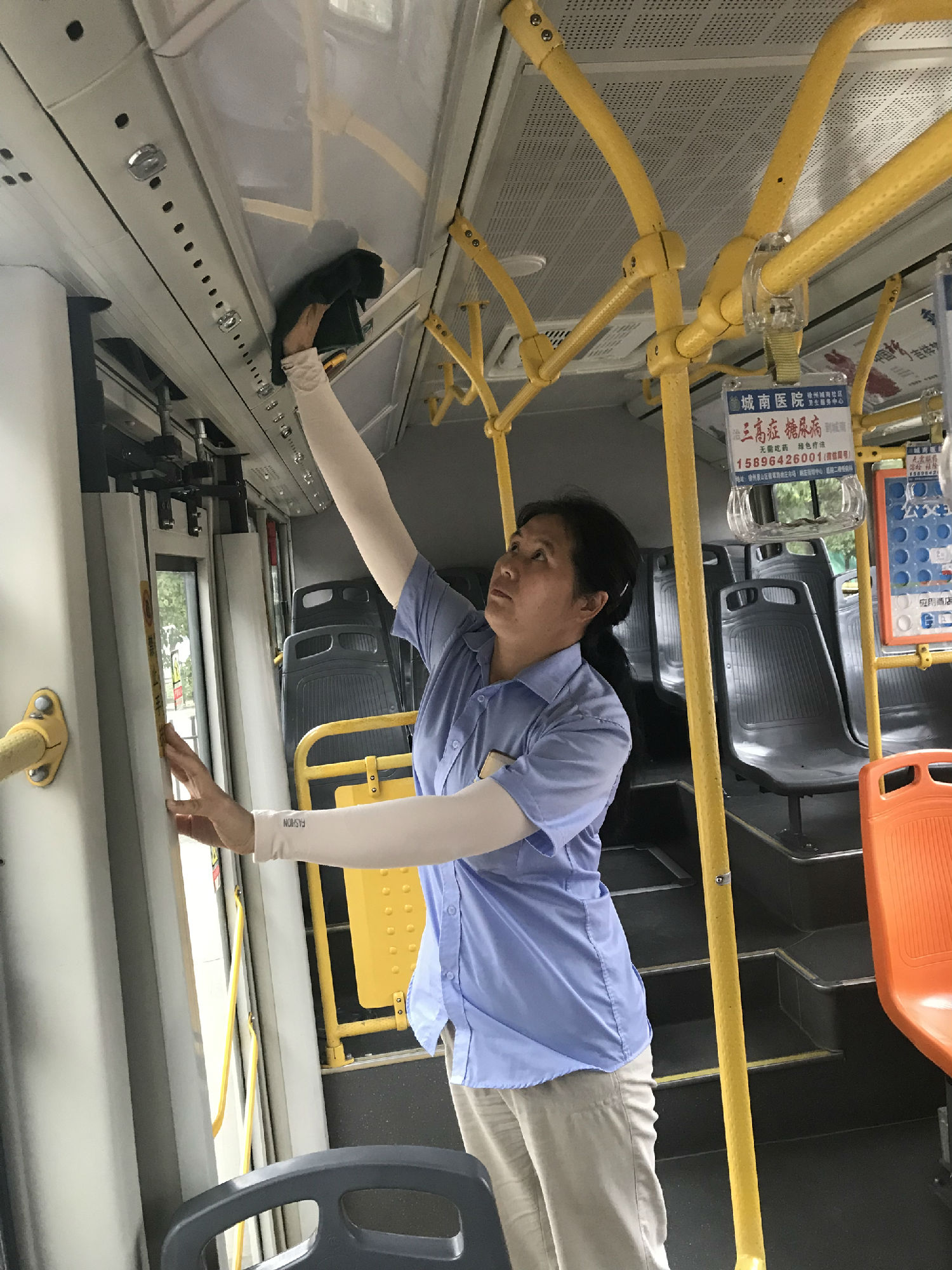 七點早高峰開始,她又趕到高鐵上客站,維持營運秩序,一遍一遍叮囑駕駛員按照服務(wù)“三五工作法”的要求,站頭站立式服務(wù)、照顧特需乘客,做好規(guī)范服務(wù)。早高峰過后,折回高鐵停車場,在班次時間允許的前提下,幫助駕駛員提水、擦玻璃、用最快的速度保證每臺車進(jìn)行地板一趟一清掃、輪胎一趟一清刷,傾倒垃圾桶等。高鐵停車場經(jīng)常停水,沒有水怎么辦?她主動找到負(fù)責(zé)工地施工的灑水車,給放幾大桶水,每臺車拎一桶,放在車上,便于保潔。對于存在衛(wèi)生死角的車輛,權(quán)洪就利用休停時間,帶著駕駛員徹底進(jìn)行大掃除,切實整改到位。在這高溫濕熱的天氣,她的衣服是干了又濕,濕了又干,她全然不顧,一心撲在工作上,從早到晚,從不叫累。