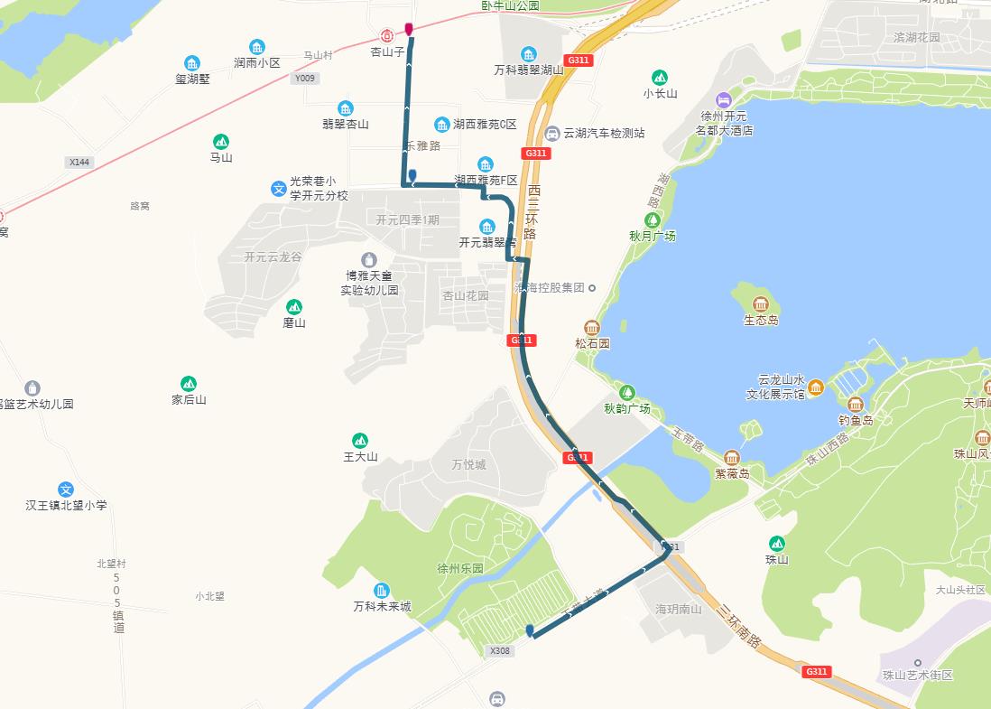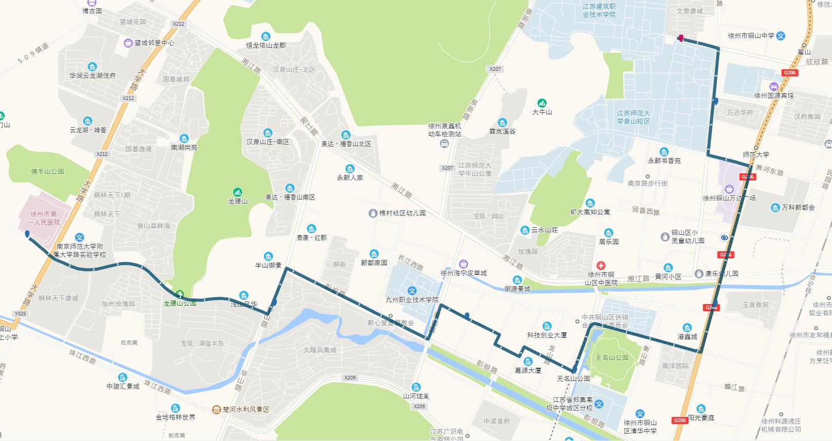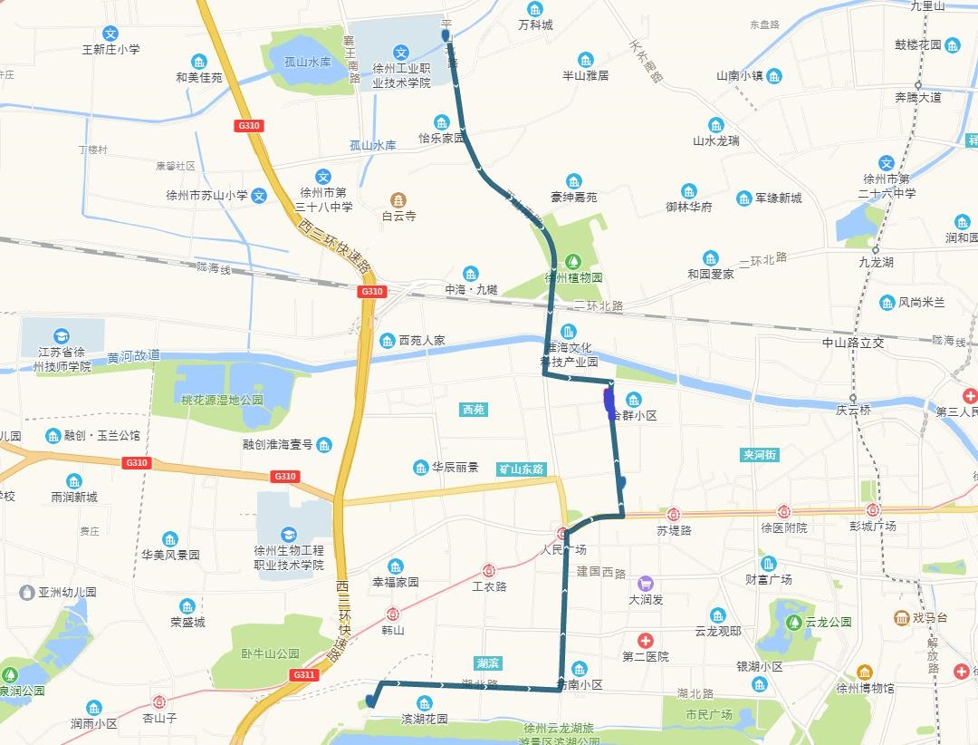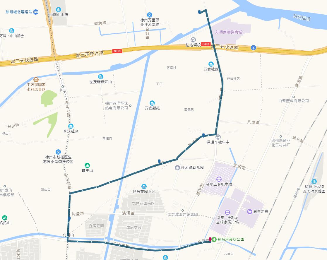 線路站點(diǎn):山南小鎮(zhèn),山水龍瑞,馬場(chǎng)湖路口,馬場(chǎng)湖,怡康花園,后勤學(xué)院北,誠(chéng)坤鋼材市場(chǎng),蘇堤北路立交橋(西),蘇堤北路立交橋(東),蘇堤路小學(xué),永業(yè)花園小區(qū),江蘇四監(jiān),銅沛路東口,中山北路立交橋