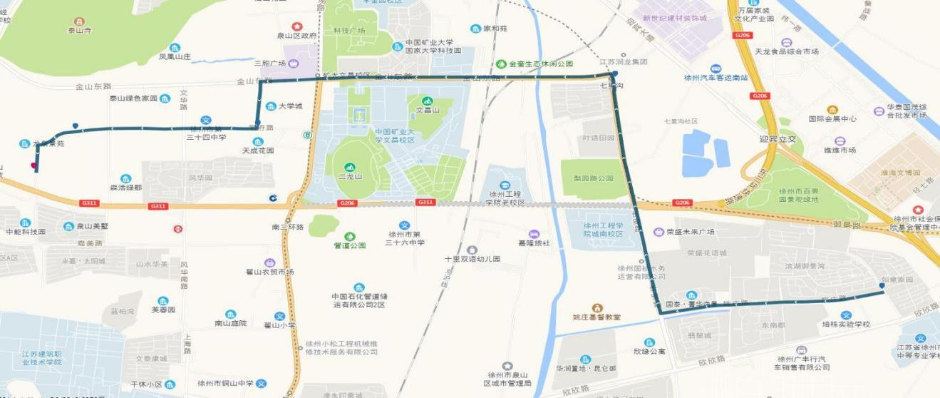線路站點(diǎn):御景灣公交首末站、濱湖御景灣南門、姚莊街坊中心、欣欣路口、七里溝地鐵站、礦大北門、大學(xué)城、天成花園、三十四中、三十中附小、泉泰嘉苑、泉山美墅西門(路西,單向)、碧水灣小區(qū)(路北、單向)、泉山法院(路南,單向)。備注:因目前雙山路與三環(huán)南路交叉口正在施工,公交車輛無(wú)法通行,319路暫時(shí)僅運(yùn)行至泉泰嘉苑。待道路貫通后,進(jìn)行全線路運(yùn)營(yíng)。