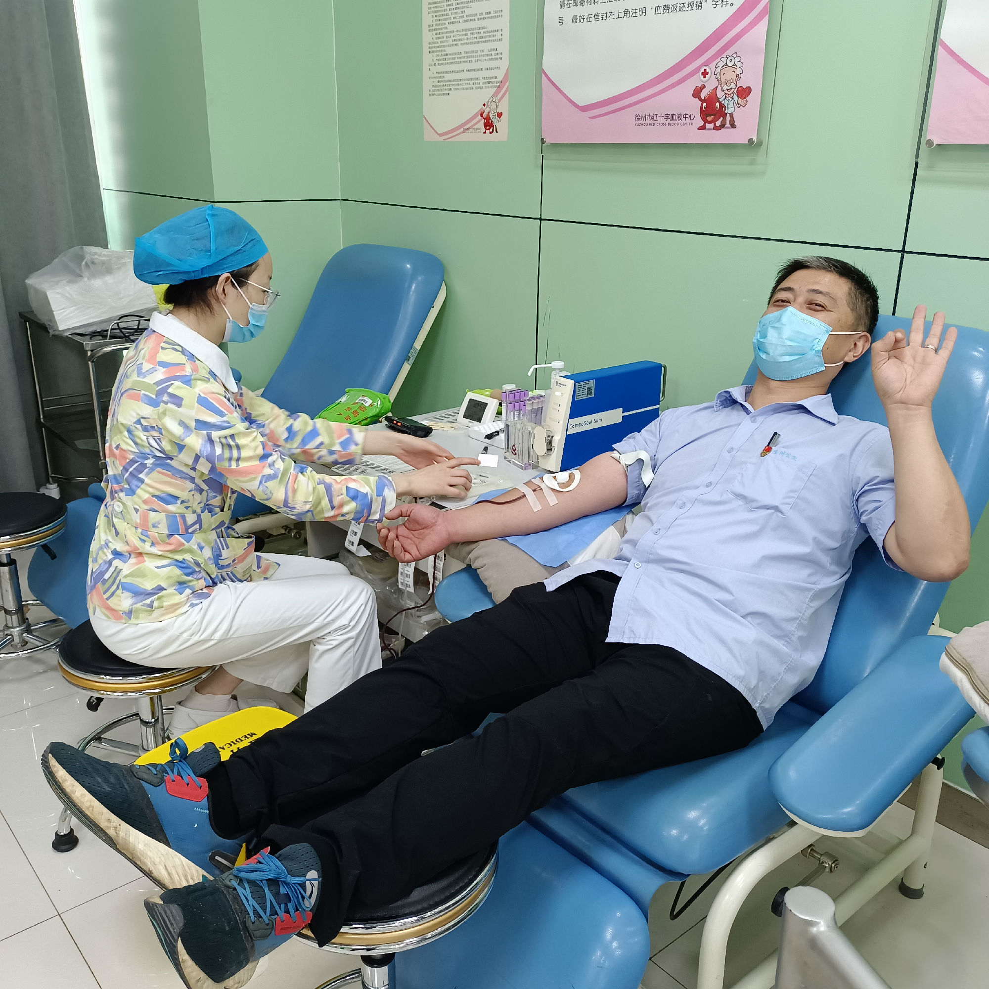 到達獻血站后,在血站工作人員的指導(dǎo)協(xié)助下,他們填寫了獻血登記表,待符合獻血標準后二人擼起衣袖進行采血......
