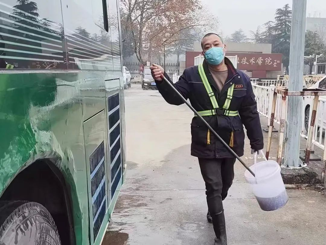 春運(yùn)期間,為保障廣大市民乘客出行需求,部分公交線路縮短了發(fā)車時間,增加了運(yùn)營車輛,再加上客流增多,路面擁堵等情況,公交車回到終點(diǎn)站停放的時間很短,又要投入到下一趟的運(yùn)營當(dāng)中,這無疑給車輛保潔工作帶來了一定的困難。因此,為確保出場車輛干凈整潔,每天天沒亮,張璞已經(jīng)在建筑學(xué)院停車場里忙起來了。只見他一手拿毛刷,一手拎水桶,開始清潔車廂外部,張璞動作嫻熟地擦拭前擋風(fēng)玻璃、車廂外部兩側(cè),不一會,他的臉上就已掛滿了汗珠,平均一輛車10分鐘的清潔時間,是他十多年工作鍛煉出來的速度。近日氣溫驟降,持續(xù)有冰凍天氣,如果抹布太濕,早晨擦座椅時會粘在上面,為此張璞都會提前準(zhǔn)備好潮濕的抹布,既能擦掉扶手、座椅、靠背上的浮塵,還不會留下水漬。像這樣日復(fù)一日的簡單工作,張璞堅持了十多年,他平均每天要打掃23臺車,平均一輛車10分鐘的清潔時間,張璞用自己的勞動,換來了車輛的干凈整潔。