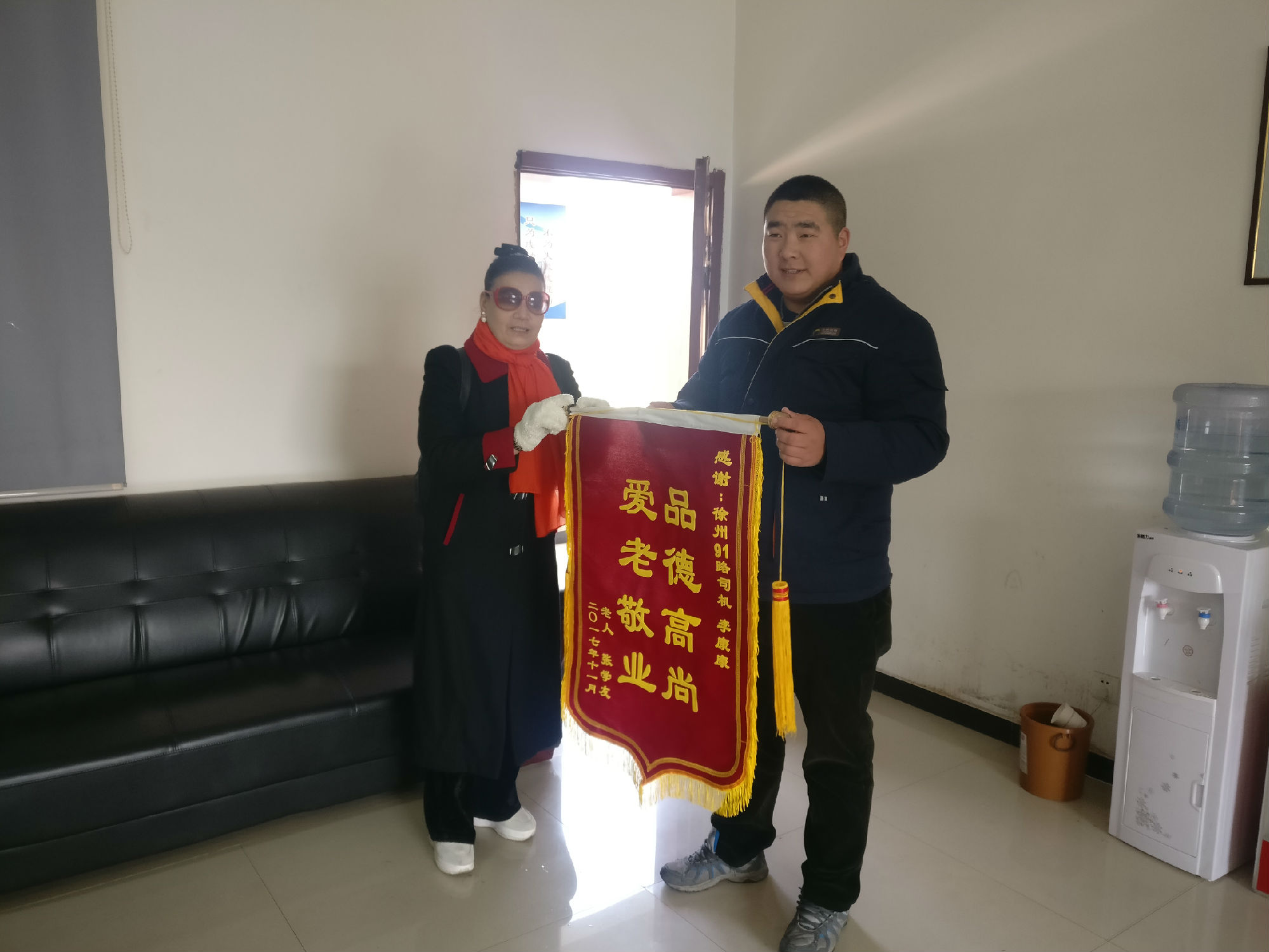 11月21日,李康康正執(zhí)行末班車的任務,夜晚寒冷,車上乘客也比較少。即將到達終點站時,車上僅剩一位年近70的張女士,李康康看她神情慌張地看著窗外。經(jīng)詢問,得知張女士剛搬到新城區(qū)住不久,迷路了??紤]到張女士年齡較大,于是就把想送張女士回家的想法向線路長及公司做出了匯報。經(jīng)批準后,他開車將張女士送回了家。事后,張女士為了表達謝意,給李康康送來一面錦旗。